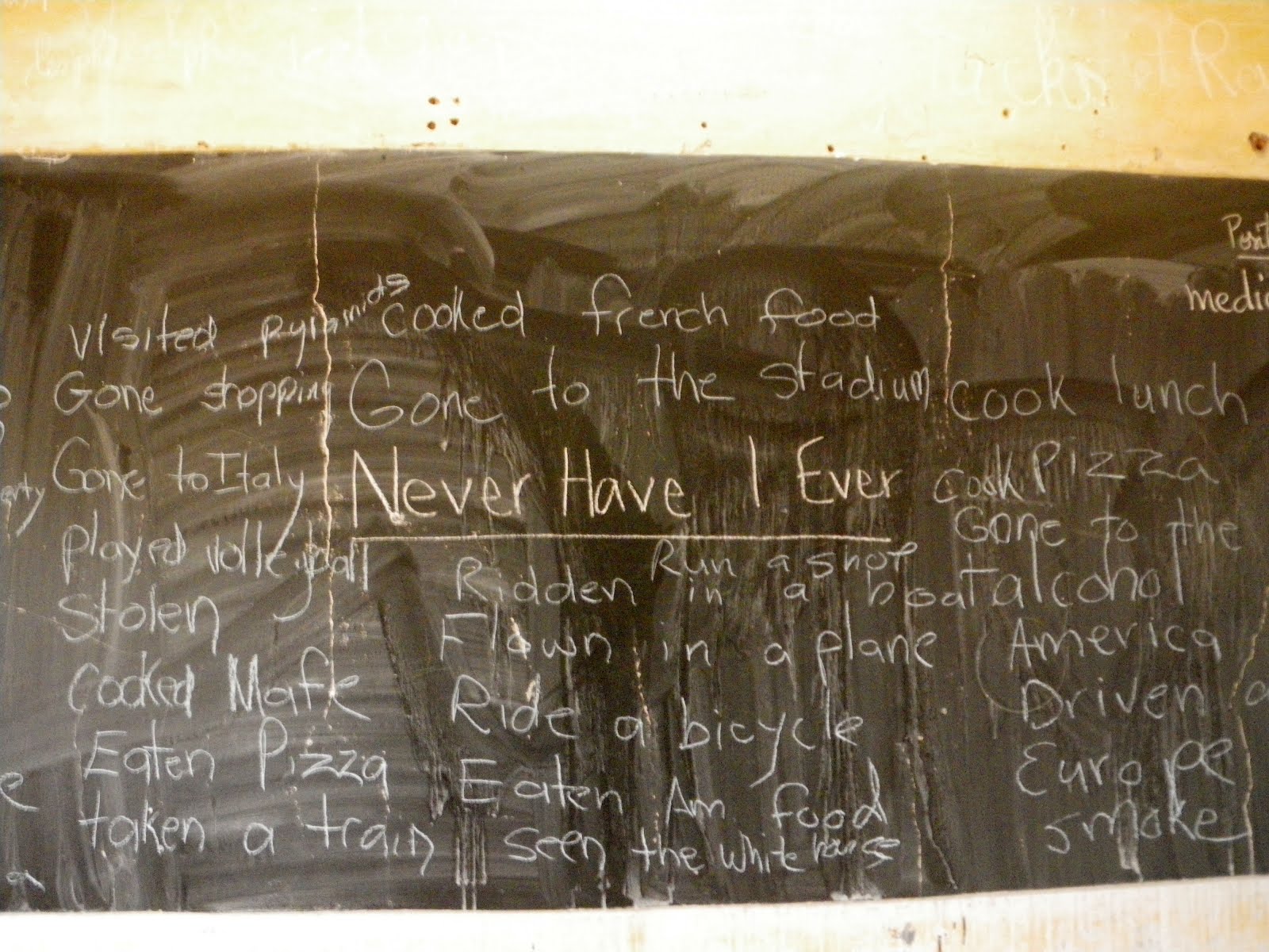 Day 3: We started the day with doing a human knot (failure since it it very much a team building exercise rather than a speaking exercise), and playing "Never Have I Ever." It was really interesting to hear some of the things that came up (swam, ate pizza, made maffe, been on a boat, been to the beach, cut onions). Afterwards, we had the final found of Jeopardy with the Lions verses the Dream Team with questions in the following categories: music, grammar, sports, politics, and careers. They did really well only being stumped on a few questions in politics, careers, and grammar, although the Dream Team ended up winning. Then, we handed out papers and had them draw a picture of something that represents America and share when they were done (a few of the drawings were: hamburgers, watches, city streets & buildings, sports fields, a pumpkin, turkey, etc). We started teaching Chris Brown's "Forever," and gave them homework to come up with questions pertaining to America that we will answer tomorrow.